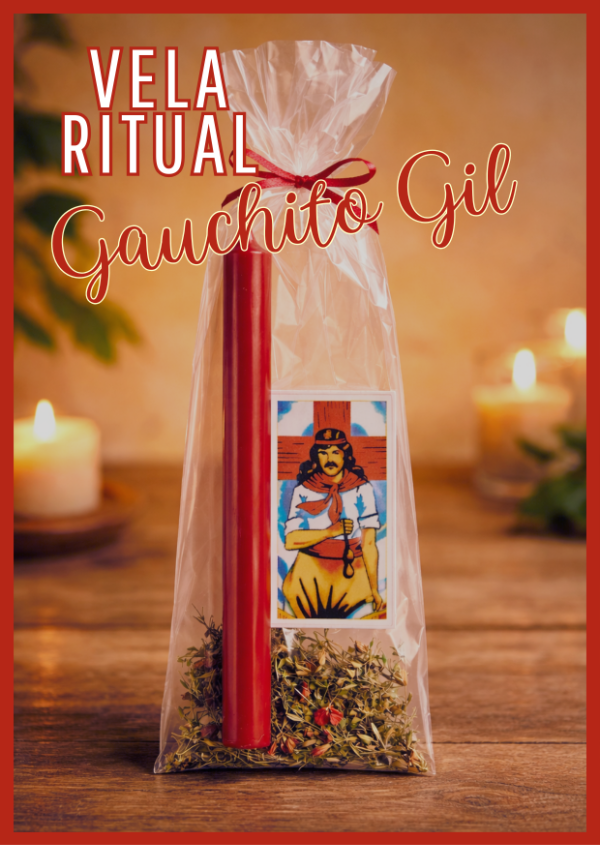 Vela ritual dedicada al Gauchito Gil, símbolo de protección, fe y pedidos sinceros.